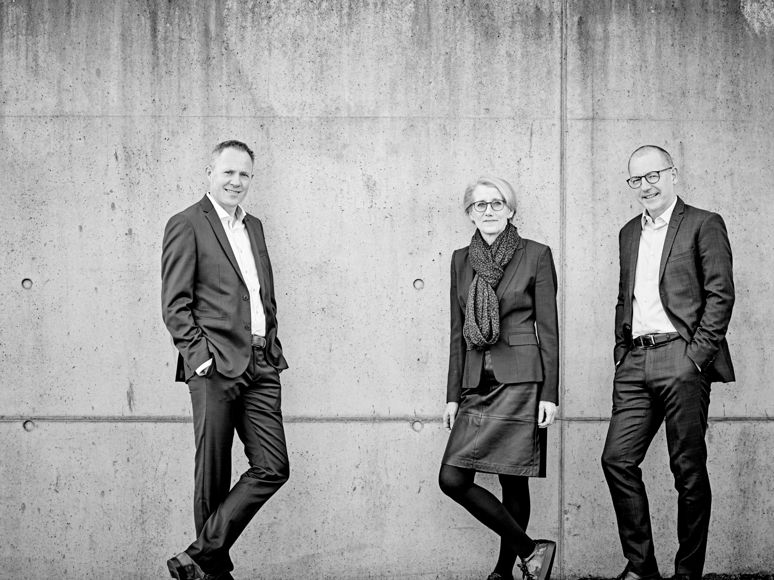 Fra venstre: Peder Nygaard, Fabriksdirektør – Birthe Tofting, Salgs- og Marketingdirektør – Johannes Saugbjerg, Administrerende direktør